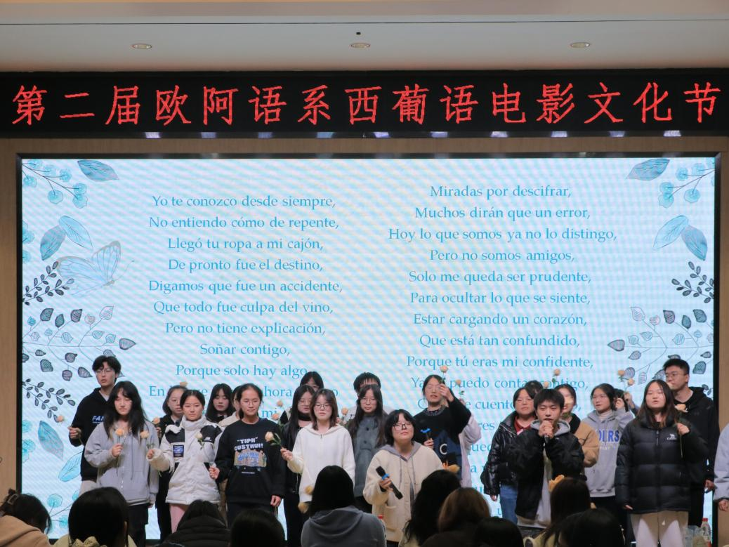 在随后进行的在电影文化节闭幕式中,2023级西语班同学们带来了西语歌曲合唱《Domingo》。同学们用悠扬的歌声将西语世界的浪漫与活力传递给了在场的观众,让大家在音乐中感受到西葡语文化的独特韵味。现场气氛热烈而欢快,充分体现了学生们对语言的热爱与对文化的深刻理解。
