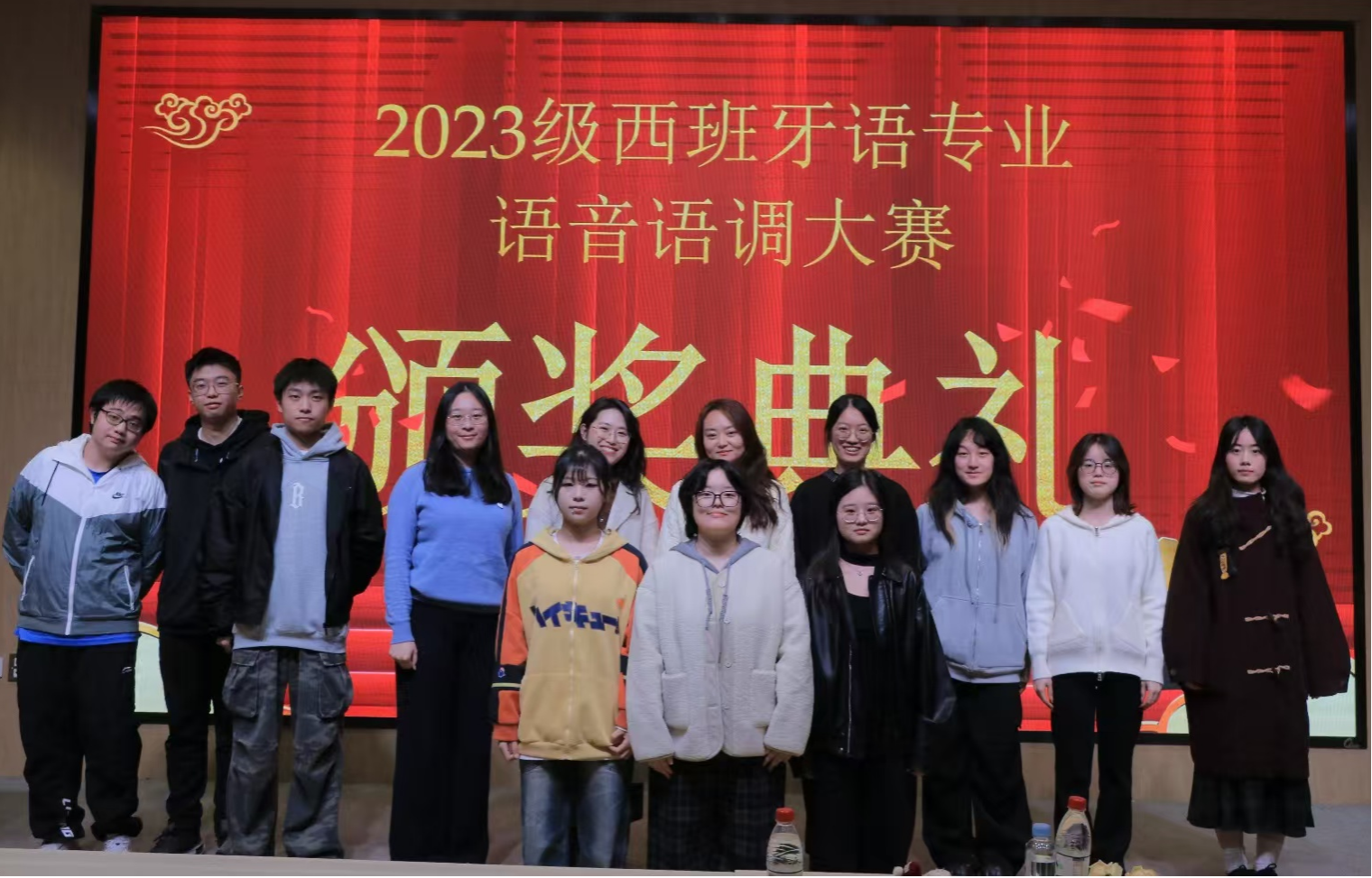 随后,文化节迎来了备受瞩目的颁奖仪式。西语语音语调大赛的各奖项依次揭晓,获奖同学们依次上台领取荣誉证书、奖品并与老师合影留念。选手们比赛中的优异表现不仅展示了个人的语言学习成果,也为其他同学树立了榜样,激励着更多学子在西葡语学习的道路上不断奋进。