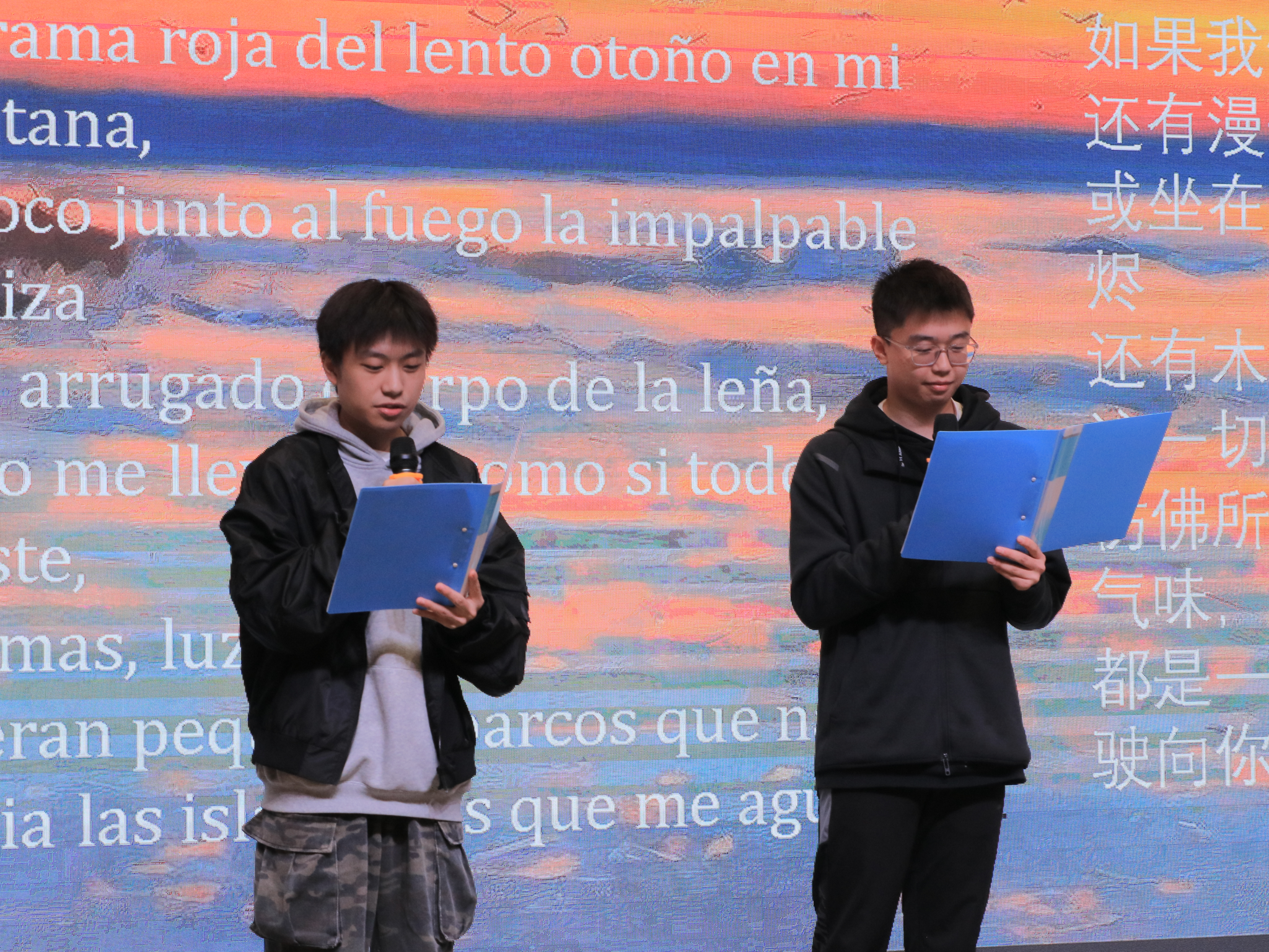 12月4日,首先进行的是2023级西语班同学的语音语调大赛。参赛选手们用标准的发音和充满情感的语调,朗诵了多首经典西语诗歌,包括聂鲁达的《如果你将我遗忘》《你每日同宇宙之光嬉戏》《再见》,博尔赫斯的《关于天赐的诗》以及温情满满的《致儿子的一封信》。选手们的精彩表现赢得了观众的阵阵掌声,并充分展示了西班牙语的独特语言魅力。