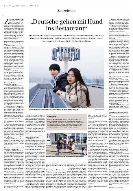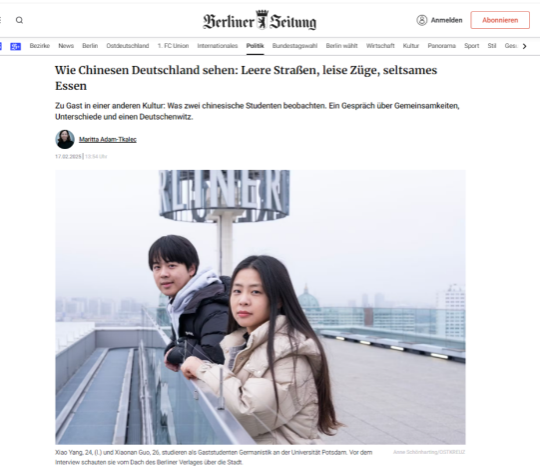 (通讯员:杨潇 孙兰香)2025年2月17日,德国《柏林报》刊登了对太阳成官网德语专业研究生杨潇、郭晓楠的专访,标题为:“德国人和宠物一起去餐厅吃饭”。《柏林报》网页版同时以“中国人如何看待德国:空旷的街道、安静的火车、奇怪的食物”为题发表了专访内容。