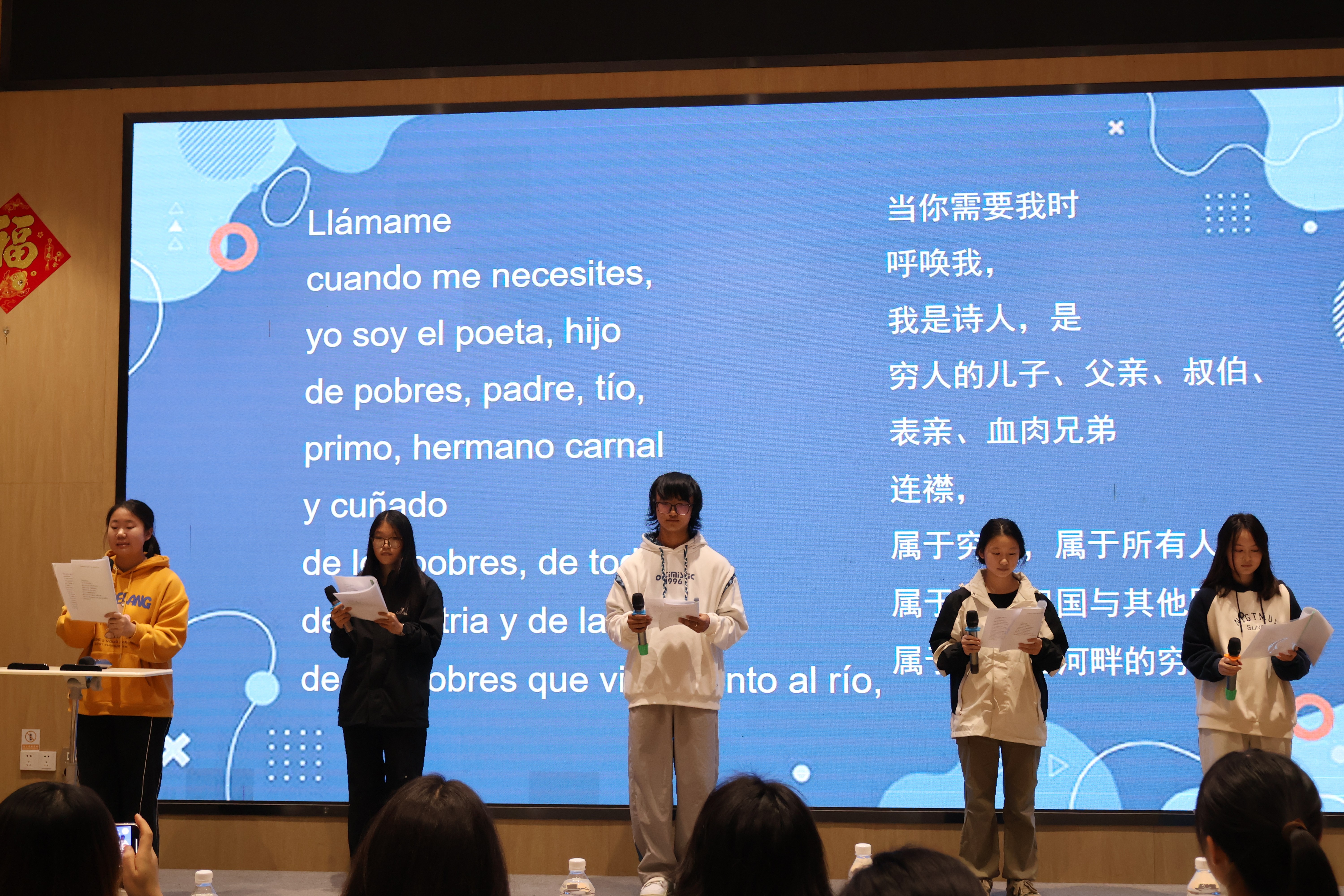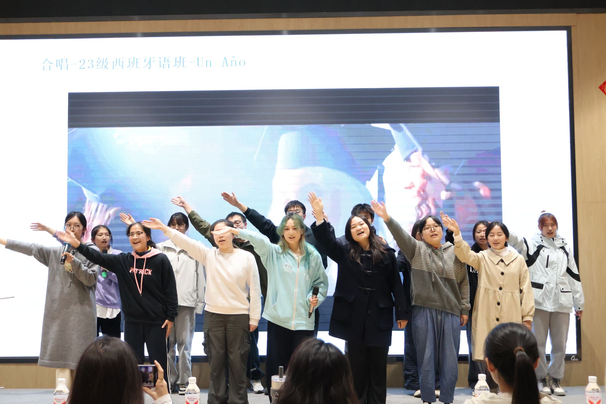 闭幕式节目精彩纷呈,由23级与24级西葡语专业学生联袂呈现。开场的西语合唱《Un año》以温暖动人的旋律拉开帷幕,唱出了青年人在时光流转中的陪伴与坚韧;随后,23级葡语班带来的葡语短剧《甄嬛传》以经典故事与葡语表达的巧妙融合,引发现场阵阵笑声;紧接着,24级西语班的诗朗诵《Oda al aire》以诗意的语言、清澈的情感,为观众展现了西语文学的细腻之美。