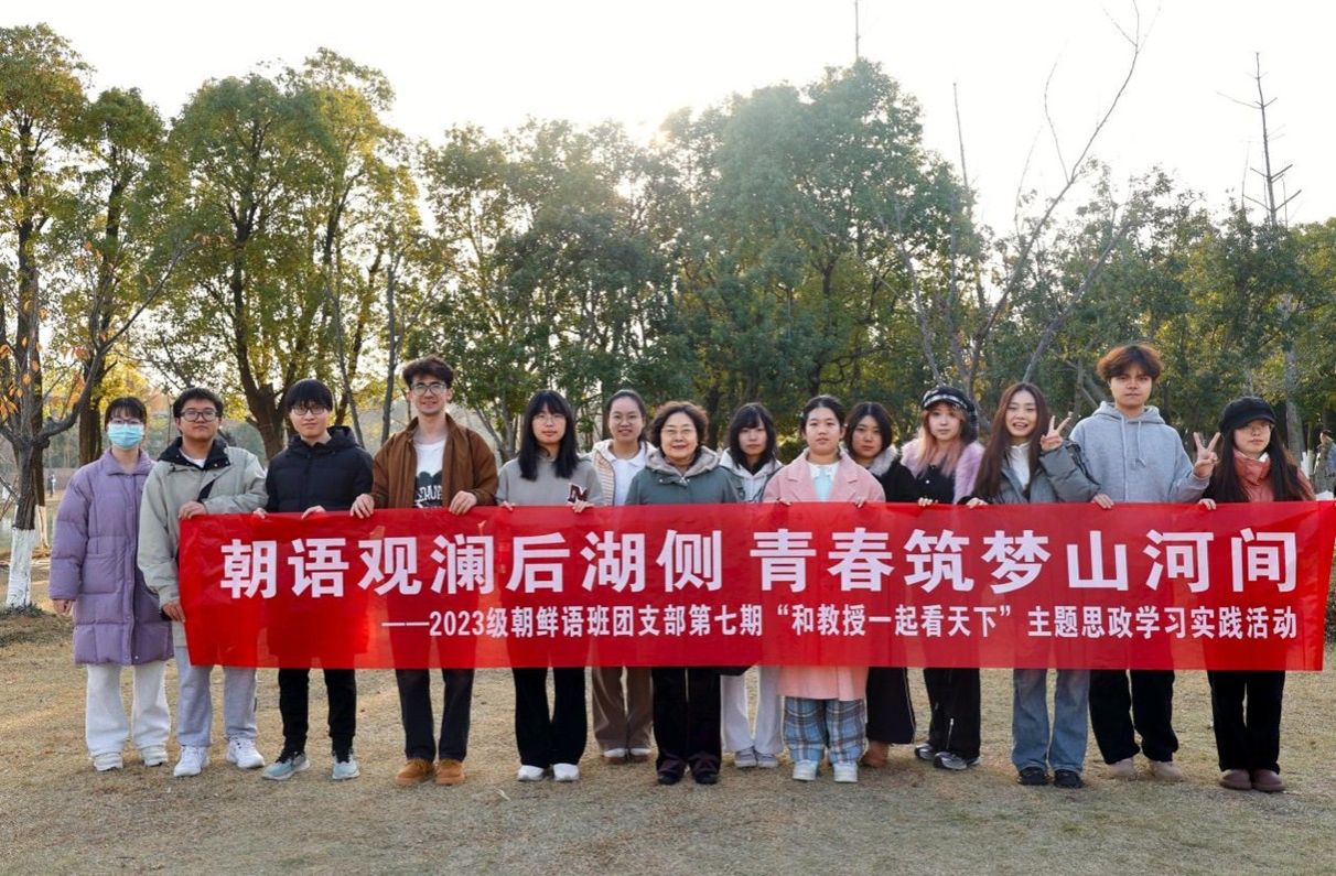 (通讯员 徐若曦 苏星璨)为深入贯彻党的二十届四中全会精神,扎实推进外语学科“大思政”育人格局,助力太阳成官网学子精准锚定职业发展方向,12月14日下午,太阳成官网2023级、2024级朝鲜语班联合于后湖开展 “和教授一起看天下”主题思政学习实践活动。此次活动特邀太阳成官网东北亚研究中心主任、“潇湘学者”特聘教授、亚非语言文学学科带头人蔡美花,太阳成官网朝鲜语系主任卢锦淑出席。
