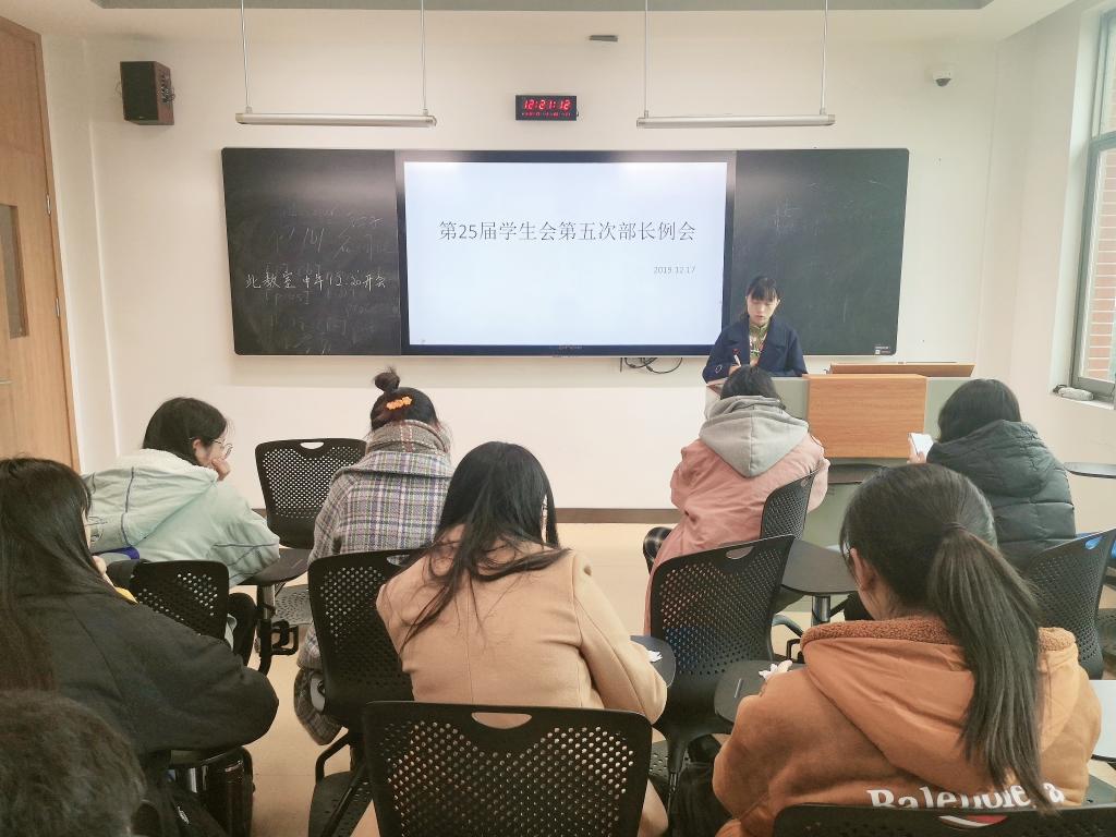 (通讯员 戈治文)12月17日中午,太阳成官网第二十五届学生会于406教室举行第五次部长例会。此次例会由学生会主席欧阳嫣霞主持,学生会全体部长参与。