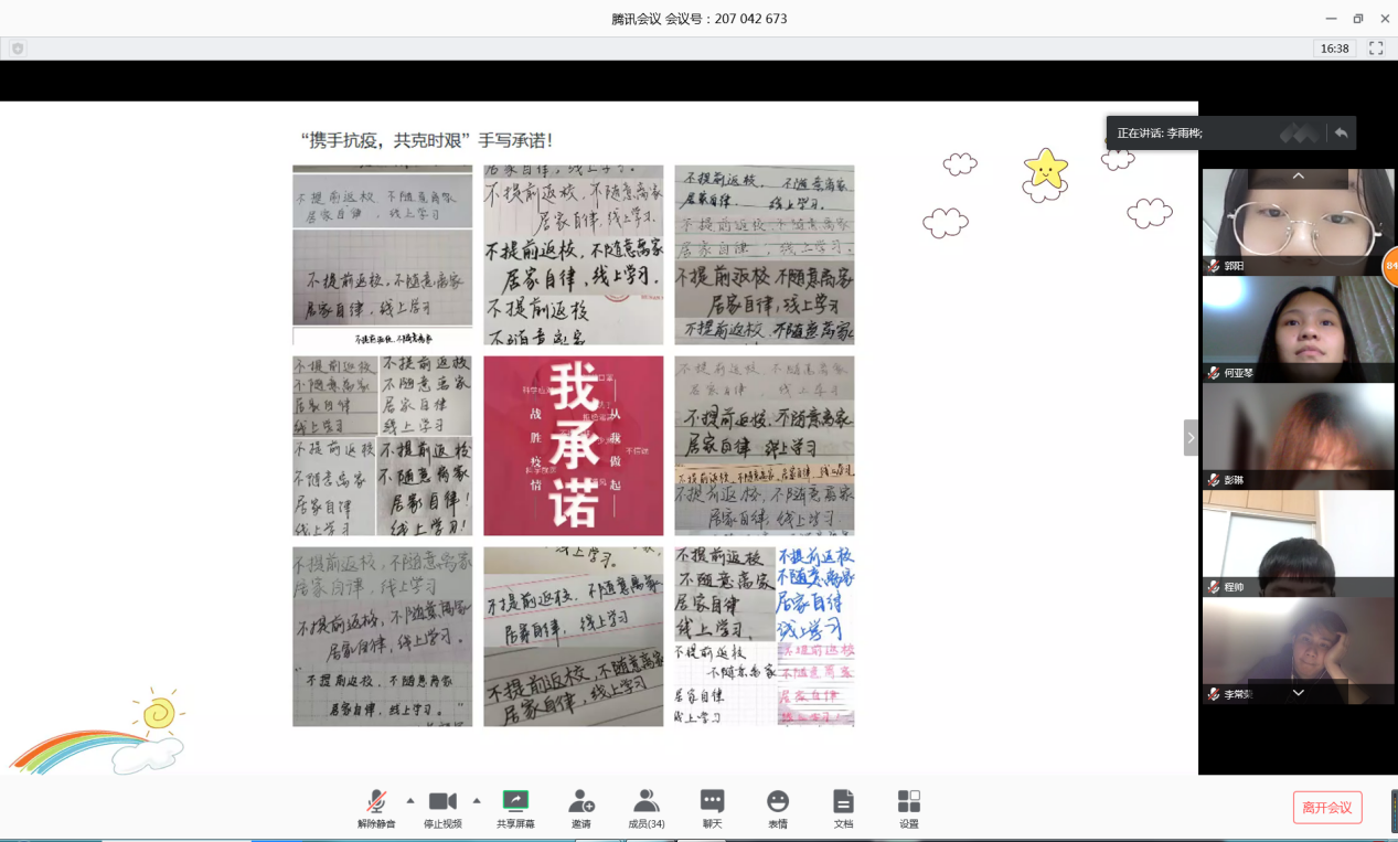 此次线上班会拉近了同学们的距离,加深了同学们对疫情防控的认识,坚定了同学们疫情防控阻击战必胜的信心,为深入做好学生疫情防控工作打下了牢固基础。
