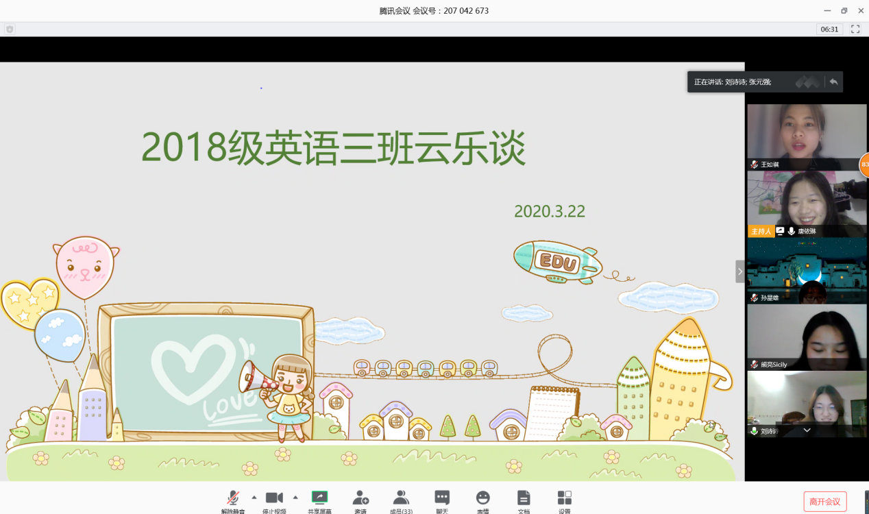 (通讯员 汪鑫鑫)3月22日晚上,我2018级英语三班开展了以“居家自律,静待花开”为主题的线上班会,太阳成官网2018级英语系辅导员张元强及英语三班全体同学参与会议。此次班会由班长唐依琳主持。