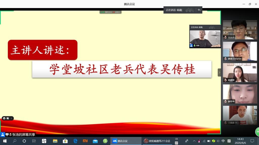 (通讯员 戈治文 李芊芊)8月6日下午,“语你同行”—15vip太阳集团官网学堂坡社区社会调研团与桔子洲街道学堂坡社区党总支携手开展“传承红军精神,争做时代新人”线上红色论坛活动。院党委书记唐建文,社区主任苏艳云和老兵代表吴传贵,郭牛山参加活动。