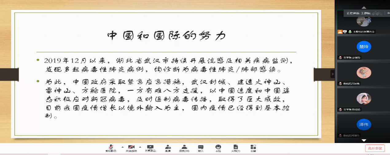 活动中,王静怡介绍了《鼠疫》的主要内容和写作背景,随后播放《鼠疫》片段。她将鼠疫和新冠疫情做出对比,展示了中国和国际在抗疫中所作出的努力,引导评论员们思考鼠疫和新冠疫情的相同点和不同点,并提出评论员们要认真思考和展望如何处理好人类与自然的关系的要求,鼓励评论员们建言献策。评论员们畅所欲言,发表自己的看法和见解,就主持人所提问题提出自己的建议。