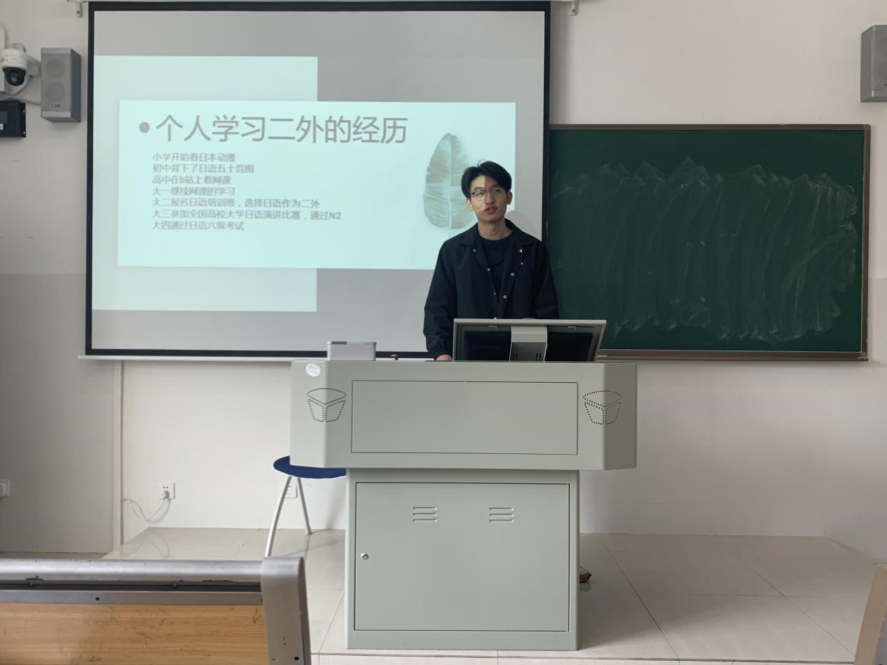 易柃江围绕“英语专业学生的二外学习”这一主题和同学们分享了经验。他将自己的分享分为“如何加强二外学习的动力”和“如何提升二外的学习效果”这两部分。在加强学习动力方面,他认为兴趣是最大的老师,英语与二外的学习是相得益彰的。他建议同学们将二外中学到的知识应用到英语中,如法语中的拉丁词词根词缀大多可以应用到英语文学写作中。在提升学习效果方面,他认为摆正心态最为重要,此外,他建议同学们多看无字幕电影、多背诵句子和文章以加强语感、尝试自我翻译。