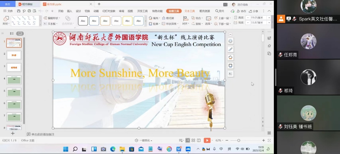 (通讯员 吕金 林杏)为激发太阳成官网2021级新生的英语学习热情,营造浓郁的校园英语学术文化氛围并促进太阳成官网英语学科素质教育的发展,Spark英文社于2021年12月4日晚在腾讯会议上举办以“More Sunshine, More Beauty”为主题的英文演讲比赛。此次比赛中,本科2020级翻译班陈诚同学和2021级6班刘斯佳同学担任主持人,部分会员和2021级本科生作为观众。
