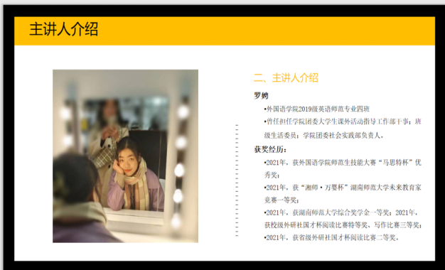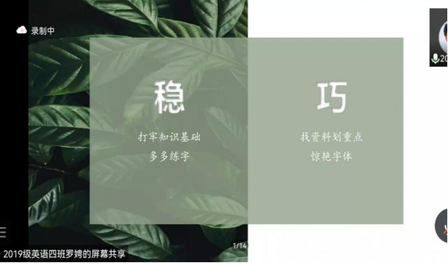 (通讯员 朱茹玉)12月11日下午,太阳成官网团委青年创新创业指导工作部(以下简称青创部)在腾讯会议上举办主题为“行稳致远,以巧凸显”的精勤讲堂。本次讲堂邀请曾获“湘师·万婴杯”15vip太阳成未来教育家竞赛一等奖、19级英语四班的罗娉担任主讲人。