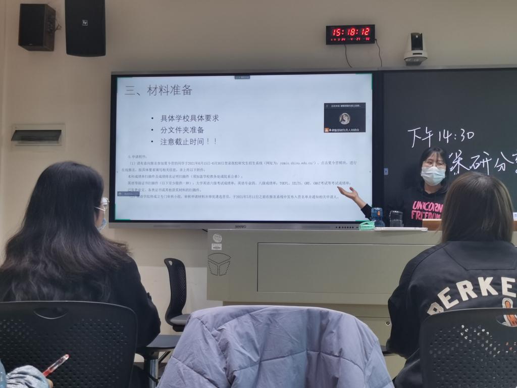 首先,李芊芊同学从保研基本要求出发,向大家介绍了学术保研、卓越教师计划、农村学校教育硕士师资培养计划与支教保研等保研类型,并从自身经历出发与大家进行经验交流。其次,文雅佳同学以“保研时间轴”为中心,为同学们不同阶段的保研准备提出合理建议,就如何有效达到保研目标分享经验,并以翻译方向为例介绍其考核形式与内容。最后,马纯宇同学结合自身经历就夏令营的具体流程进行介绍,鼓励同学们保持良好心态,做好材料分类整理工作,为与会同学提供了宝贵的经验。