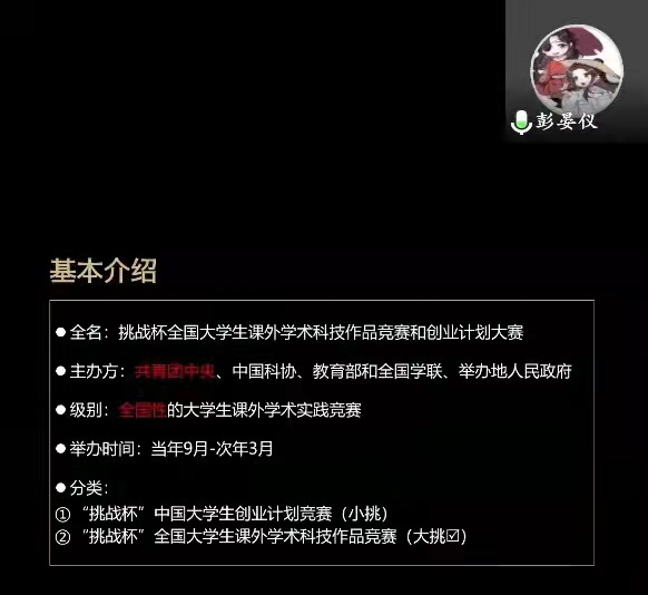 彭晏仪根据个人比赛经历,介绍了“挑战杯”全国大学生课外学术科技作品竞赛,并结合比赛各环节提出了自己的建议。她鼓励同学们积极将想法付诸实践,在挫折面前相信自己,勇于进行一步步的探索。同时她表示,创新源于灵感,成于行动。问答环节,同学们就如何调整心态、协调专业学习与竞赛时间等方面提出疑问,彭晏仪一一解答,呈现了一期精彩的讲堂。