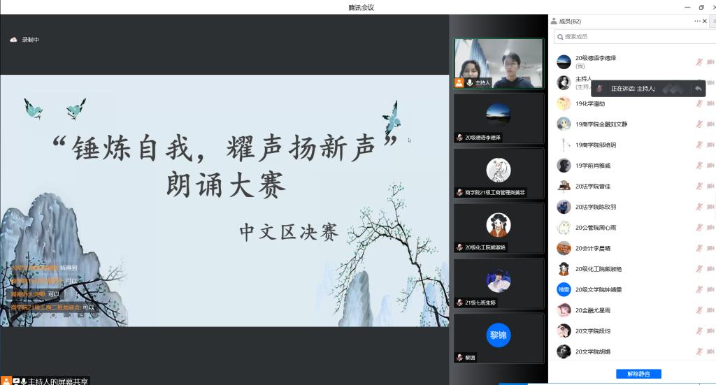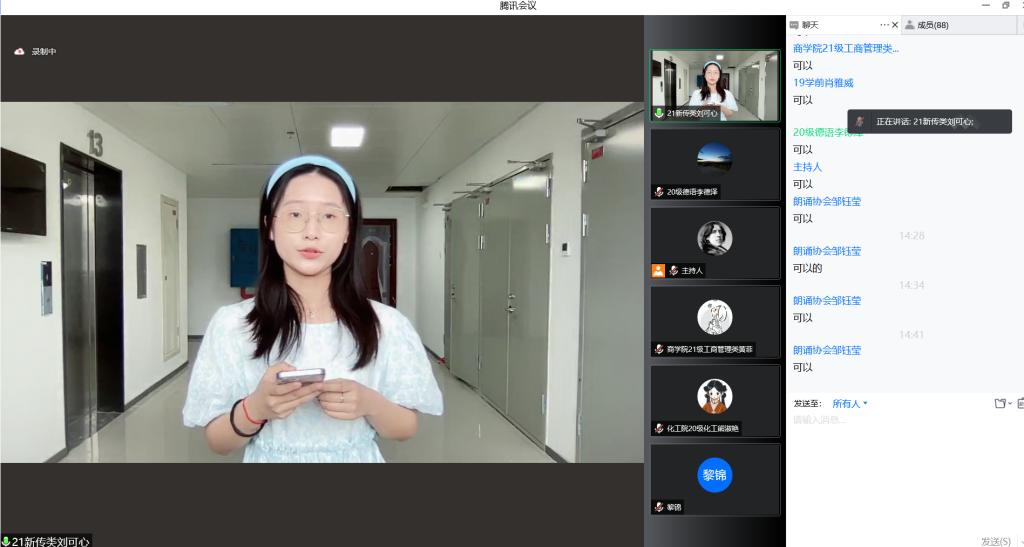 中文赛区决赛于2022年5月2日下午在腾讯会议举办,选手及社团部分会员参与此次会议。15vip太阳集团官网日语系副教授向卿出席此次会议并发言,指出朗诵是发音、语言和表现的艺术,并从三个维度阐释了此次比赛的意义和重要性。决赛采取线上抽题的形式举行,选手抽取到给定的朗诵材料后,进入5分钟的准备环节,随后上台朗诵诗歌并对其进行解读。教科院肖雅威和新传院郭玥含获得此赛区一等奖。