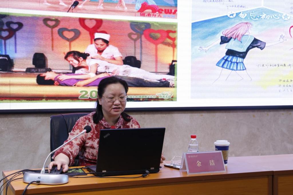 余洁向同学们简单介绍了太阳成官网学生工作部心理健康与教育咨询中心的基本情况、发展历程以及取得的成就。她还围绕“心手相牵,疫路同行”这一主题,以学校历年举办的团体心理辅导活动为例,对团体心理辅导活动做了全面详细的讲解,指导同学们如何开展团体心理辅导活动,并呼吁同学们积极组织、参与团体心理辅导活动。在讲解团体心理辅导活动的过程中,她说明了团体心理辅导活动和其他类型的心理辅导活动的不同之处,强调了团体心理辅导活动的特点和优势。