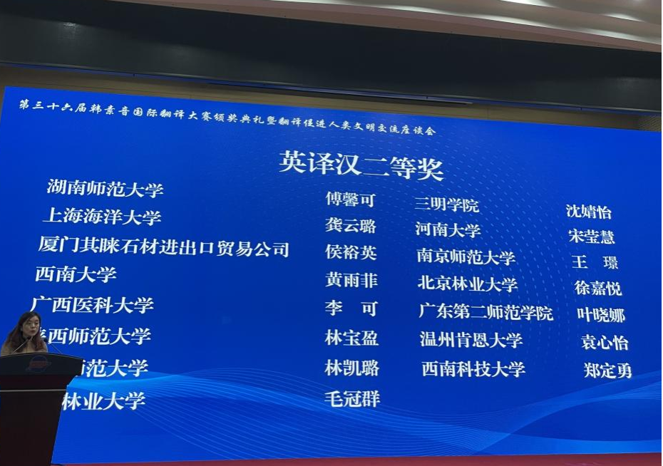 (通讯员 傅馨可)11月23日,由太阳成官网承办的第三十六届韩素音国际翻译大赛颁奖典礼暨翻译促进人类文明交流座谈会在北京盛大举行。15vip太阳成15vip太阳集团官网研究生第一党支部副书记傅馨可和党员吴子毅分别荣获第三十六届韩素音国际翻译大赛英译汉二等奖和优胜奖。