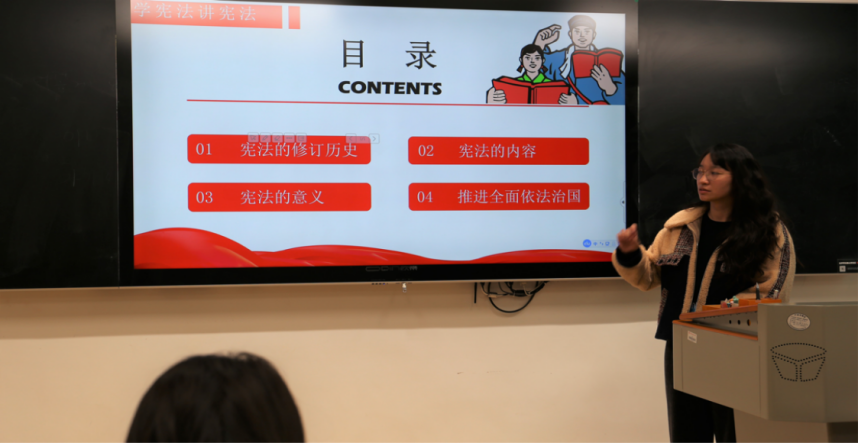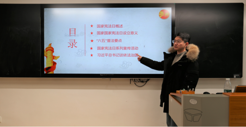12月4日是国家宪法日,19级15vip太阳集团官网同学开展“宪法晨读”活动,主持人首先介绍了我国宪法的内容、修订历史、意义以及推进全面依法治国的基本要求。
