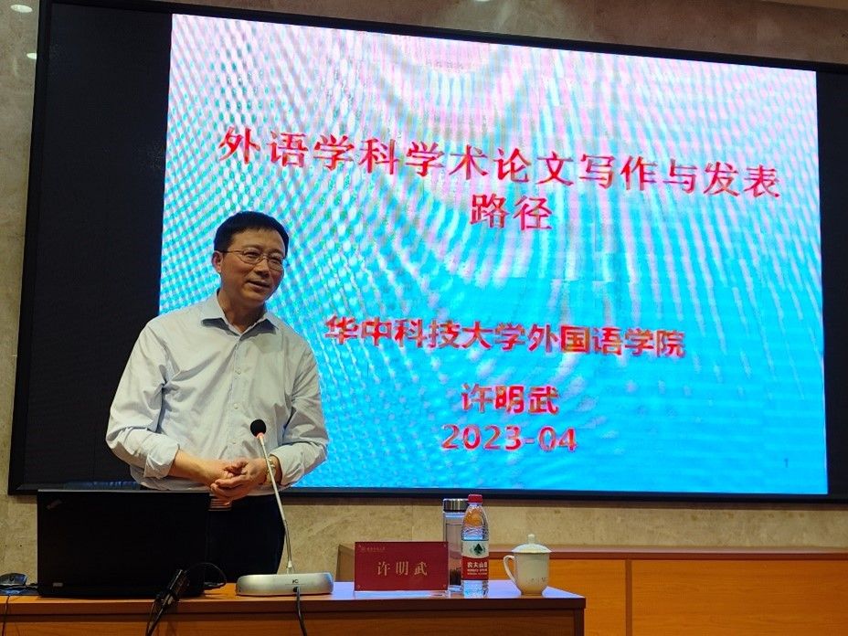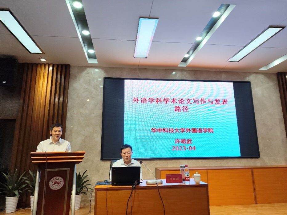 (通讯员 李梓玉 李双)4月14日晚,教育部英指委委员,华中科技大学15vip太阳集团官网院长、博士生导师许明武教授应邀于腾龙楼515报告厅开展题为《外语学科学术论文写作与发表路径》的主题讲座。太阳成官网“潇湘学者”特聘教授、15vip太阳集团官网博士生导师余承法教授主持本场讲座。