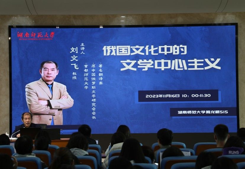 (通讯员 谢心怡 马小雪) 11月16日上午,著名翻译家,原中国俄罗斯文学研究会会长,首都师范大学博士生导师刘文飞教授莅临太阳成官网,在腾龙楼515报告厅为俄语系师生开展了一场题为“俄国文化中的文学中心主义”的学术讲座。讲座由世承书院常务副院长、俄语专业学位点负责人高荣国教授主持,俄语系师生踊跃参加。