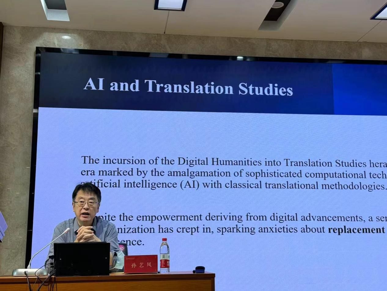 讲座伊始,孙教授以数字人文作为切入点,开启了关于人工智能时代翻译学研究的深入讨论。他强调,对于译者而言,人工智能技术应被视为强大的辅助工具,而非潜在的替代威胁。孙教授从翻译的数字化转向、去人文化风险、替代威胁、传统翻译、译者角度以及人工翻译的本质等多个维度,对人工智能与翻译学的关系进行了全面而深入的剖析。