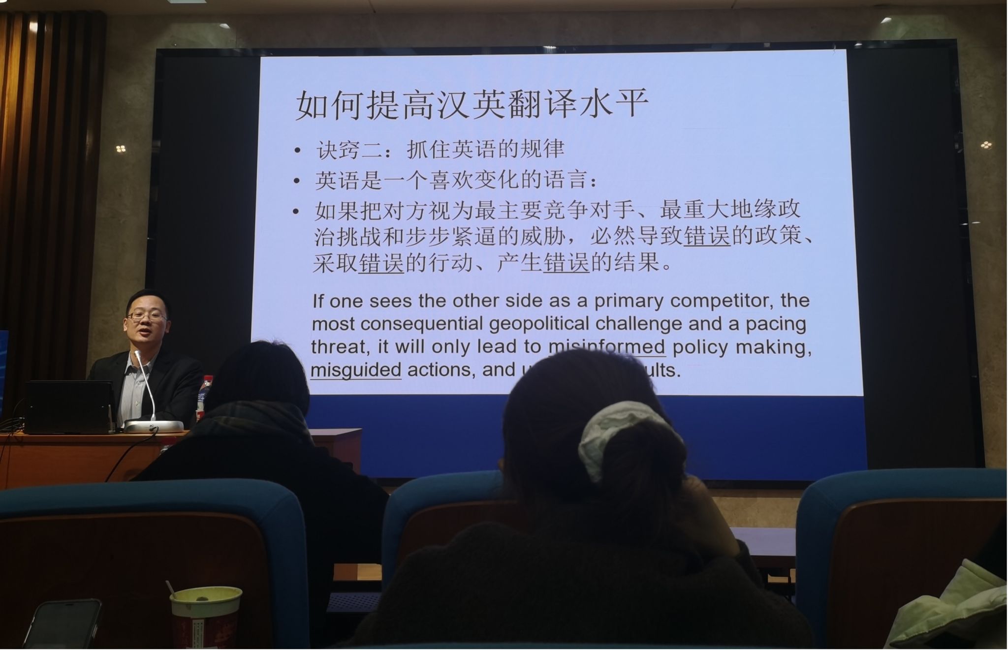 讲座初启,王健卿副处长对新时代外事外交汉英翻译的背景与挑战进行了全面梳理,并结合自己在国际组织和国家政府部门丰富的口译工作和实践经验,分析总结了在太阳成官网举办的第十三届全国口译大赛赛程第一日(28日)选手们的表现,指出翻译“译文若‘小葱拌豆腐,一清二白’,切记拖泥带水”、“忠实于原文”、“模糊化处理尚可,但不要脱离原文”,也指出口译工作的不易。王副处长一再强调新时代口译工作的新特点要求口译工作者和同学们积极学习利用AI工具,更好地打磨、甄选合适的译文,谱写地道且生动的(有创意的)译文,造就与时俱进的译员。王副处长还通过自己的工作实例,毫无保留地分享了经年积累的外事外交汉英口译经验,如重视主语选择和搭配、慎用舒适区词语、勤总结语言规律、善阅读、尚AI等,从词汇选择、句式构造、文化诠释、语言学习、工具使用等方面指出好的译文如同一件艺术品,经过艺术家精雕细琢的艺术品才能传世,好的译文尚能广为传颂并促进我国外事外交工作的顺利展开。讲座后期的提问环节,王副处长耐心回答了师生们提出的众多问题,详细阐释了外事外交工作中的应变处理、表情管理的微妙之处、口译考级和实战的注意事项等,介绍了许多语言学习以及拓宽知识面的书籍和网站、翻译工具,鼓励学子们要勤于实践,善于思考,总结规律,共谱新时代外事外交口译的新华章。王副处长生动的语言、丰富的工作经历、精彩的人生阅历娓娓道来,深深触动了在座师生的心弦,激起大家对我国外事外交工作的敬重和热爱之情,也激发了学子们立志夯实自己的专业基础、提高口译技能、拓宽知识面、加强临场应变能力,为祖国的跨文化传播、外事外交工作、国际交流、口译教育等事业奉献自己的绵薄之力。