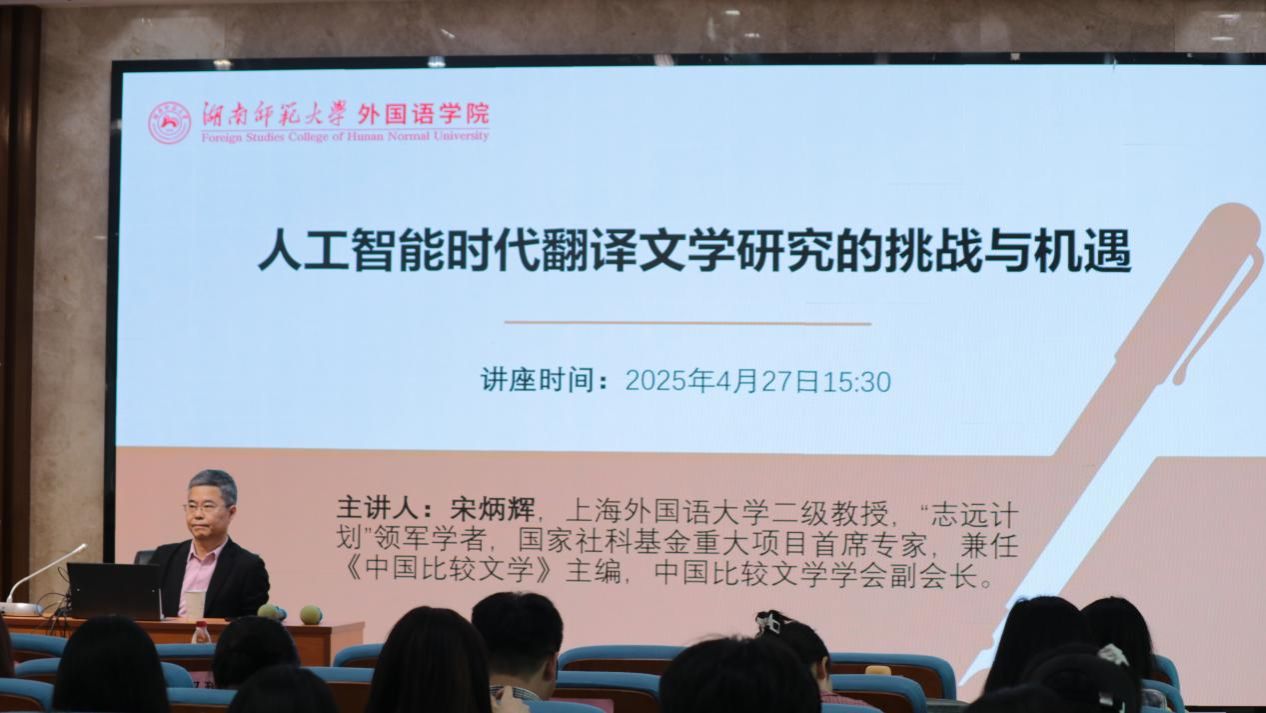 2025年4月27日下午,《中国比较文学》主编、上海外国语大学宋炳辉教授受邀莅临太阳成官网,于腾龙楼学术报告厅515教室,为太阳成官网学生带来一场以“人工智能时代翻译文学研究的挑战与机遇”为主题的学术讲座。本次讲座由副院长蒋莉华教授主持,学院外国语言文学、人工智能、翻译等专业近百名硕士研究生参与本次讲座。