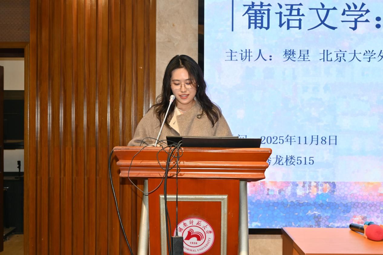 讲座伊始,樊星教授指出,葡语文学因地理分布的多元性呈现出鲜明的多元文化特质,但在欧洲文学格局中,相较于意大利文学、法国文学等传统中心流派,长期处于边缘地位。她强调,葡语文学发展初期存在原创性不足的问题,创作多以模仿法国文学为主,尚未形成自身独特风格。