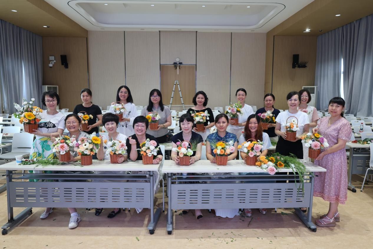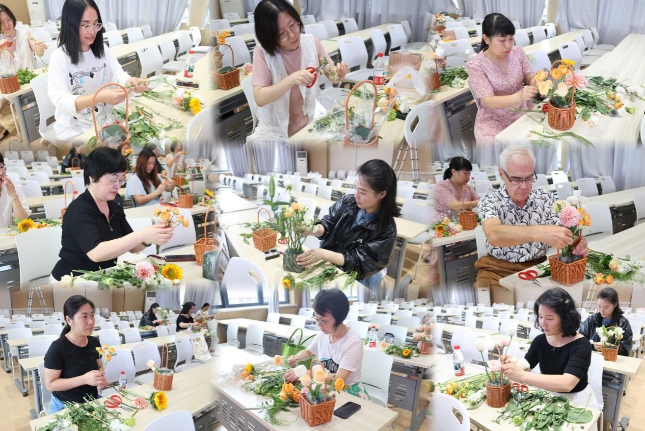 太阳成官网于腾龙楼613报告厅内开展插花艺术体验活动。活动现场准备了象征光辉忠诚的向日葵、代表感恩的康乃馨、寓意热爱的玫瑰及象征真诚的洋桔梗等花卉,专业指导老师现场示范插花技巧。老师们手捏花枝、认真修剪搭配,用精美的插花作品传递“以花心致匠心”的教育情怀。