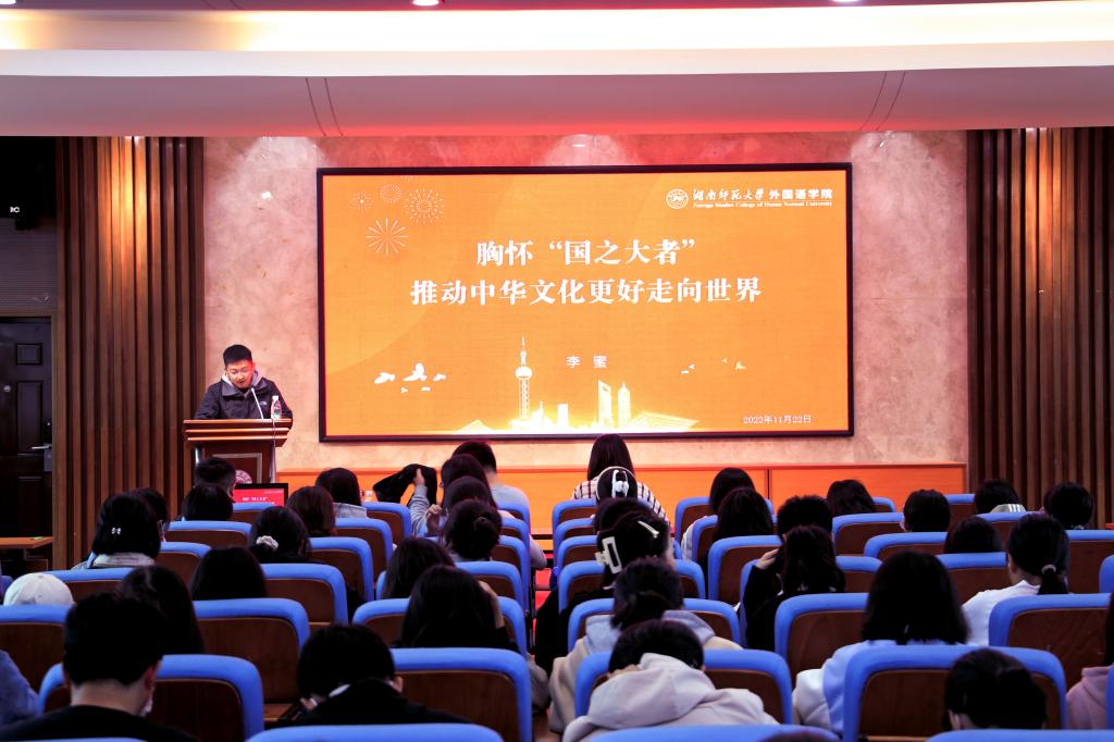 李蜜以“胸怀‘国之大者’,推动中华文化更好走向世界”为题,简述了党的二十大报告中的主要内容,带领大家回顾了习近平总书记在引领国际传播能力建设方面的重要论述,并结合张庆伟书记来太阳成官网宣讲时对青年提出的五点希望,引出了他对当代青年讲好中国故事的实践路径的思考。他对当代青年如何讲好中国故事、传播好中国声音提出了五点建议。一是要充分树立民族自信心和自豪感;二是要从自身做起,从身边的每一件小事做起,积极以实际行动维护国家形象;三是要努力学习好跨文化交流的方法技巧,深入学习领会习近平外交思想,将其作为理论指导,更好地在国际舞台上讲好中国故事,做好跨文化交流合作,实现其内在的实践内涵;四是要注重国际传播的双向性,在传播中国声音的同时也要善于倾听来自国际的声音;五是要在坚持问题导向的基础上讲好中国故事。