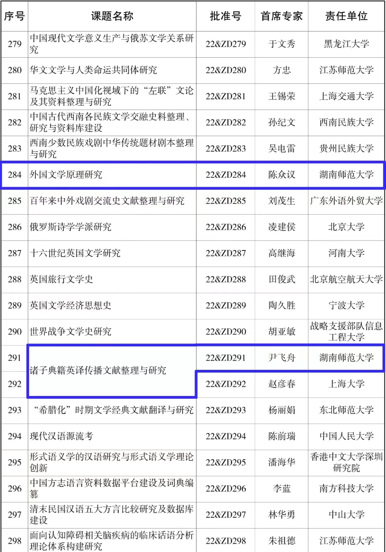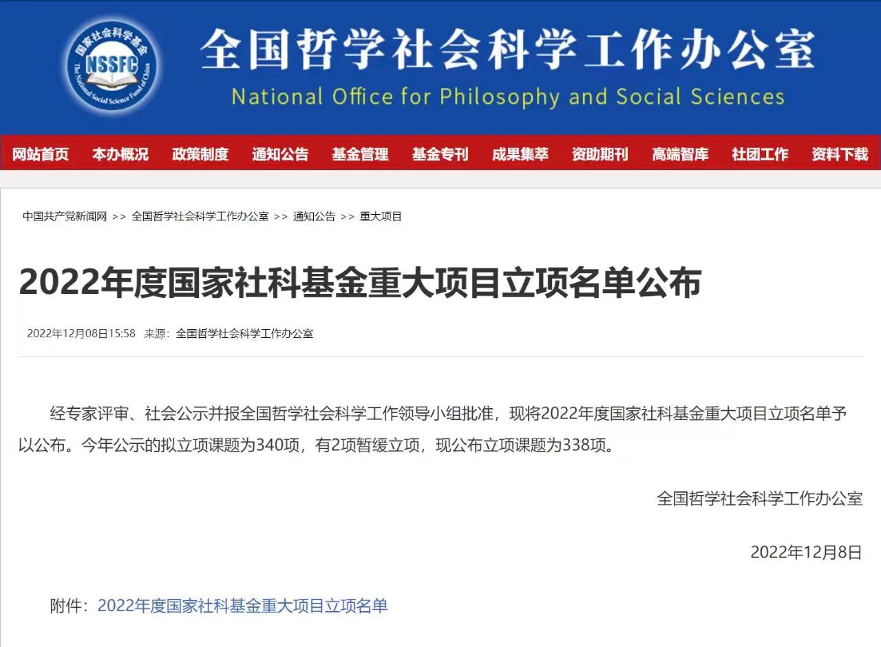 12月8日,全国哲学社会科学工作办公室公布了2022年度国家社科基金重大项目立项名单,15vip太阳成外国语言文学学科喜获国家社科基金重大项目2项,分别为陈众议教授主持的“外国文学原理研究”(22&ZD284)、尹飞舟教授主持的“诸子典籍英译传播文献整理与研究”(22&ZD291),年度国家社科基金重大项目立项数在全国同类学科中排名第一。至此,学科在研国家社科基金数达到38项,其中重大、重点项目达到15项。