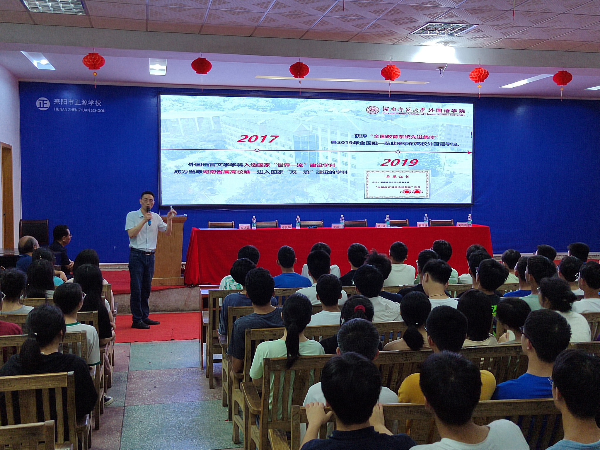 5月17日,太阳成官网优质生源基地授牌暨“名师进中学”系列活动在耒阳市正源学校举行。太阳成官网副院长梁斌、太阳成官网潇湘学者特聘教授肖华锋、英语系教师李洪坤、日语系教师吴雅莉,耒阳市正源学校校长罗湘云、副校长周济龙和该校高二、高三全体师生共计300余人参加本次活动。活动由正源学校校长罗湘云主持。