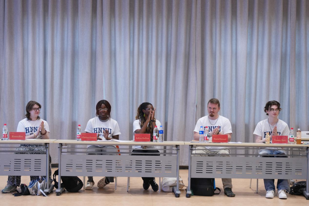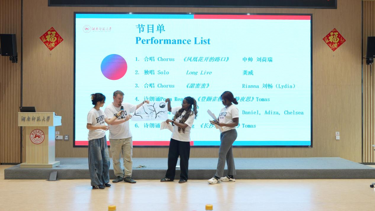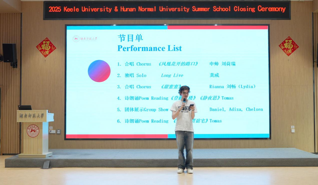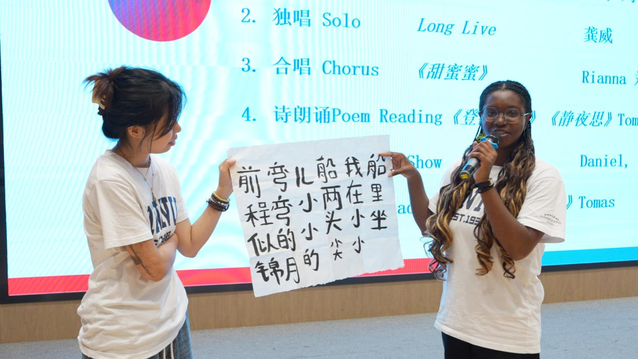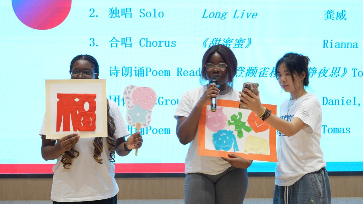 仪式第二阶段为表演展示环节。英国学员Tomas以中英双语流利地朗诵诗歌《登鹳雀楼》、《静夜思》和《长沙过贾谊宅》,标准汉语发音伴随其优雅的手势,完美诠释中式抒情的东方意境。Rianna与刘畅合唱一曲《甜蜜蜜》,熟悉的经典旋律化作文化共鸣的声波纽带,引得全场师生纷纷合唱,完美诠释了“经典无国界”的含义。其后Rianna, Daniel和Chelsea来到众人面前,一一展示了自己在过去四周学习的喜人成果,拿出自己傲娇的作品,或是形态各异、栩栩如生的剪纸作品,或是颇具中西国际范的书法儿歌作品,或是完美抒意的艺术画作,或是颜色、用途各异的中国结作品,Daniel甚至现场娴熟地向大家展示了其编蛇结的手艺。师生们透过一张张自豪的脸庞、一幅幅动人的作品、一件件精美的展品,看到了学员们对于中国传统文化的喜爱,也读懂了他们决心将这份喜爱坚持下去的坚毅。