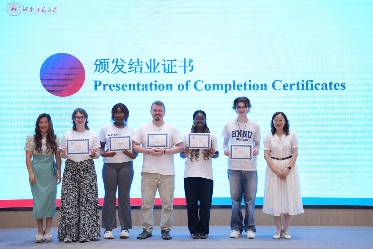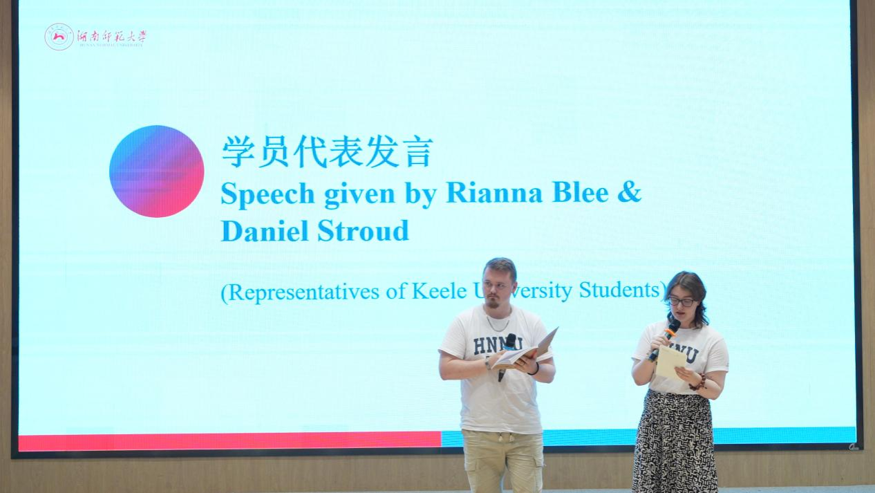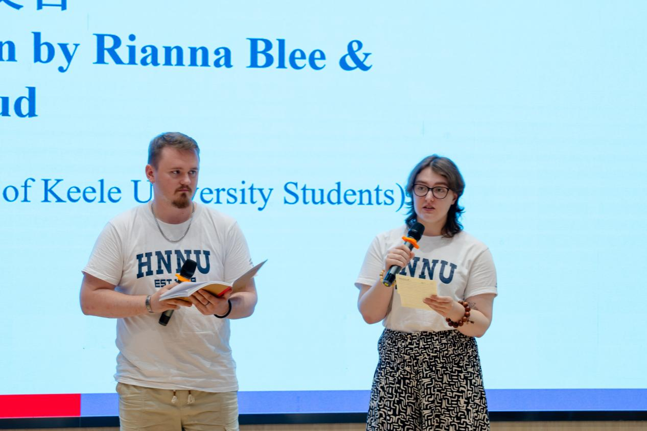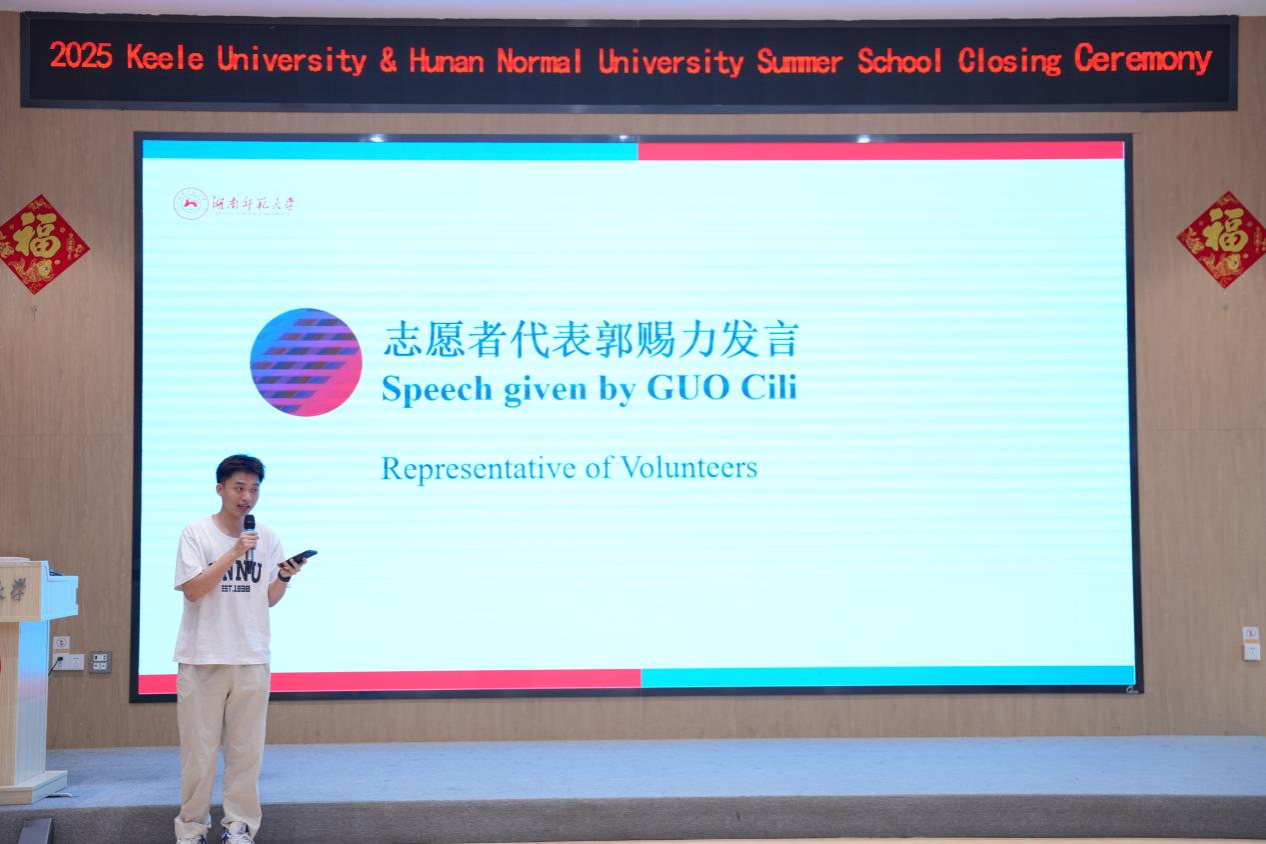 仪式由何君博士主持,第一阶段是发言致辞,首先由15vip太阳集团官网蒋莉华副院长致辞。蒋院长首先对促成本届暑期项目顺利开展的所有领导和师生表示感谢:感谢项目负责人何君老师顺利带领学员和志愿者团队12次乘坐大巴,跨越5座城,化解各种危机和误解,称其对本次文化之旅发挥的“定位及导航”功能全程在线;感谢英国基尔大学欧阳主任和15vip太阳成李苗副主任促成该项目顺利达成并持续开展发挥的决定性作用;感谢授课教师们的辛苦努力和激情满满,如书法王老师的落笔生花,非遗剪纸陈老师手中“驱魔”剪的神力;“老师们不仅是在授课,更是在‘武装’中国文化”,使我们博大精深的中国文化能够全面、立体地呈现在学员们面前,从而更好地促进两国文化的交流。”蒋院长也对志愿者们发挥“双语桥”和“记录仪”作用的出色表现给予了充分的肯定,并表示“给大家颁发诺贝尔奖也不为过!”最后庆祝学员们从四周之前初入中国的迷茫到今日小有成就的沾沾自喜,称他们是“语言和文化的勇士”、“美食探索者”,并改编王维的《送元二使安西》表达对于英国学员离开的不舍,对他们未来的美好期许,祝愿大家未来如橘洲焰火永远璀璨!