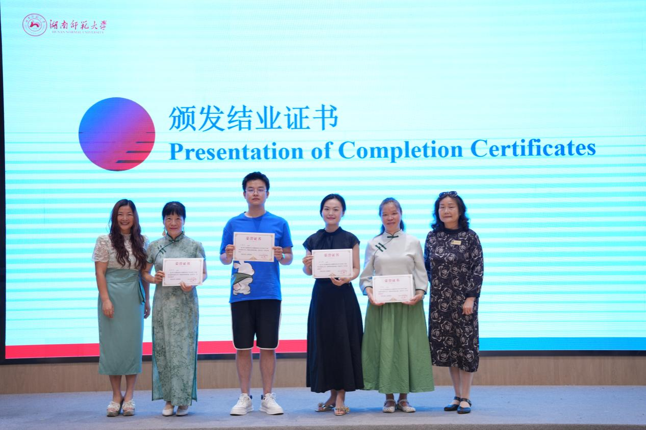 仪式的第二个环节是颁发证书,李苗副主任、欧阳爱媛主任和蒋莉华副院长分别上台为学员们授予结业证书、为授课教师颁发荣誉证书、为优秀志愿者授予荣誉证书并与大家合影留念。不管是老师、学员还是志愿者们,手捧证书,脸上幸福的笑容记录了此刻的美好,这段暑期学校珍贵的回忆将会深深镌刻在彼此未来的生命里。