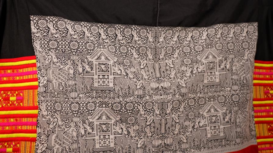 采访途中,沈燕希拿来她的得意之作——《老鼠娶亲》。这一作品融合了两种国家级非物质文化遗产滩头年画和花瑶挑花的技艺,其中的图案是近几年设计出来的创新花样。沈燕希指着布料上的“岩石花”,告诉团队成员这是花瑶一族的标志。
