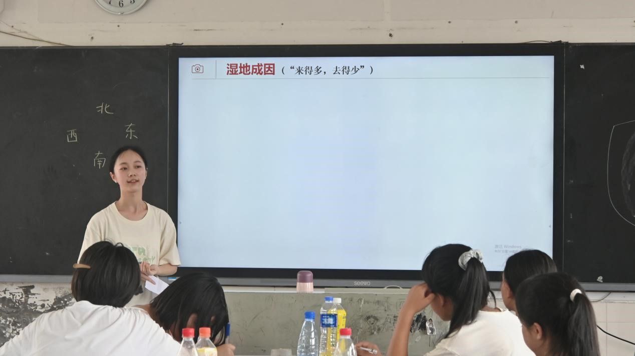 宋奕芳以十八溶洞和洞庭湿地为例讲解了喀斯特地貌和湿地有关的地理知识。她通过展示鬼斧神工的溶洞景点的视频和图片引起学生兴趣,并利用动画视频生动讲解了喀斯特地貌成因,以此帮助学生们推理溶洞形成过程。此外,她以学生所熟知的稻田引入湿地,使学生更加深刻地了解了湿地的定义及类型,引导学生分析不同地区的湿地成因及价值,并分析了洞庭湿地的变化以及开发与保护。