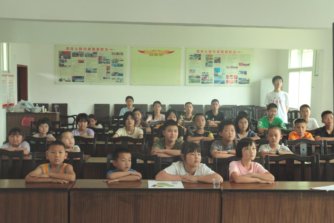 谷志亮代表实践团对孩子们的到来表达了热烈的欢迎。在课堂上,师生以接龙的形式介绍自己的姓名和兴趣,并通过”击鼓传花”游戏拉近师生之间的距离。在才艺展示环节,四位同学共同演唱《最炫民族风》,课堂氛围活跃,学生活动参与度高。随后,实践团成员详细介绍了即将开展的课程,包括通识教育课程,国别文化课程和基础英语课程。