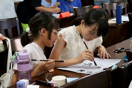 理论讲解后,学生们在实践队成员的指导下,拿起毛笔,在纸上认真练习毛笔字与苗文书写,并积极与小组成员分享交流自己的作品与收获。大家在实践中不仅掌握了相关书写技巧,更对文字所承载的文化有了更深刻的理解。