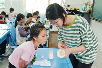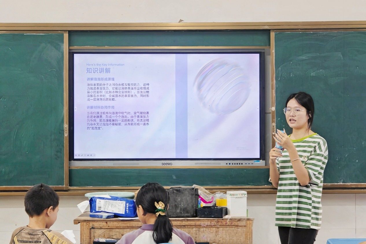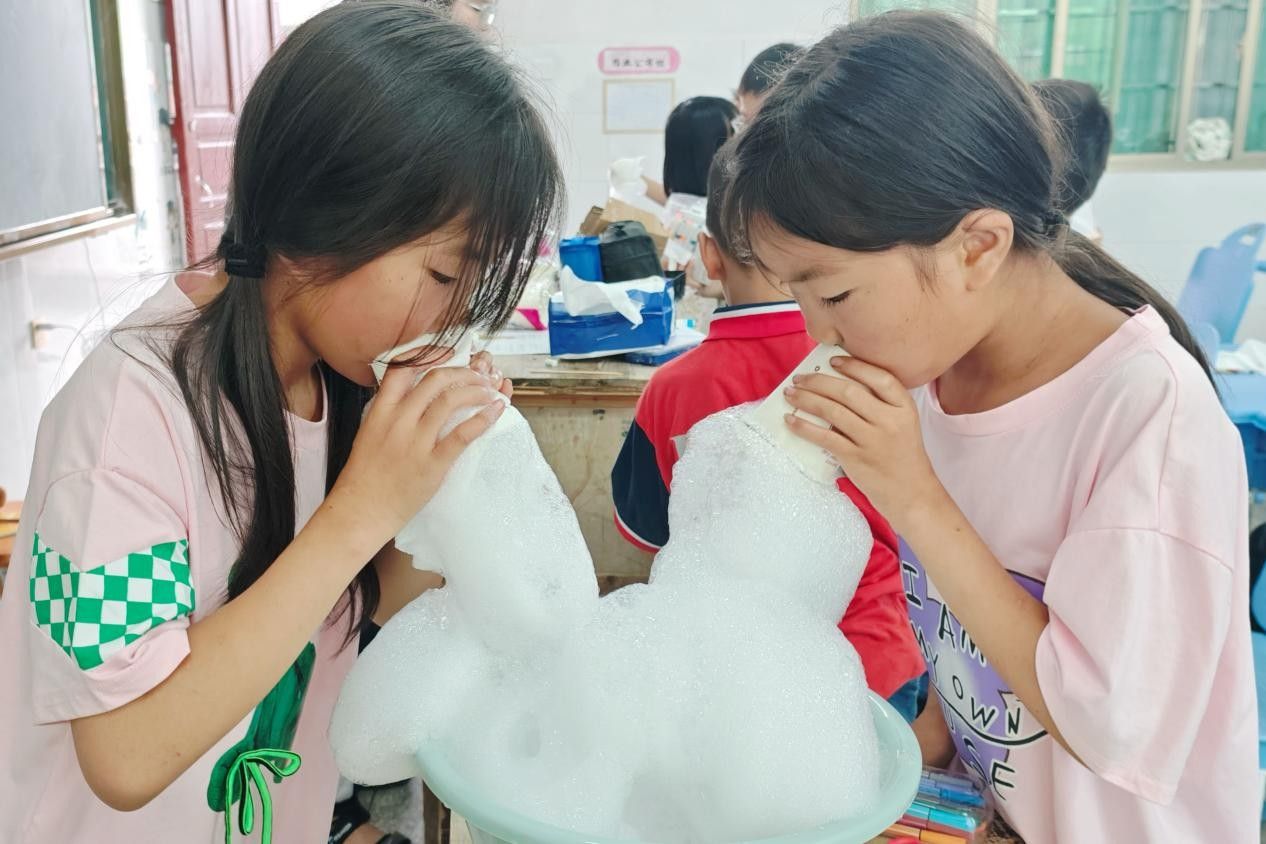 为让学生们更好掌握实验技巧,曾媛分步讲解操作流程并亲自示范。学生们跟着步骤一步步尝试,遇到拿捏不准的地方就主动举手请教。曾媛和实践团成员走下讲台,挨个查看学生操作,及时帮大家调整手法。随着一个个晶莹的泡泡龙从纸杯中“钻”出来,学生们发出阵阵欢呼。他们举着实验成果,依次向实践团成员展示。