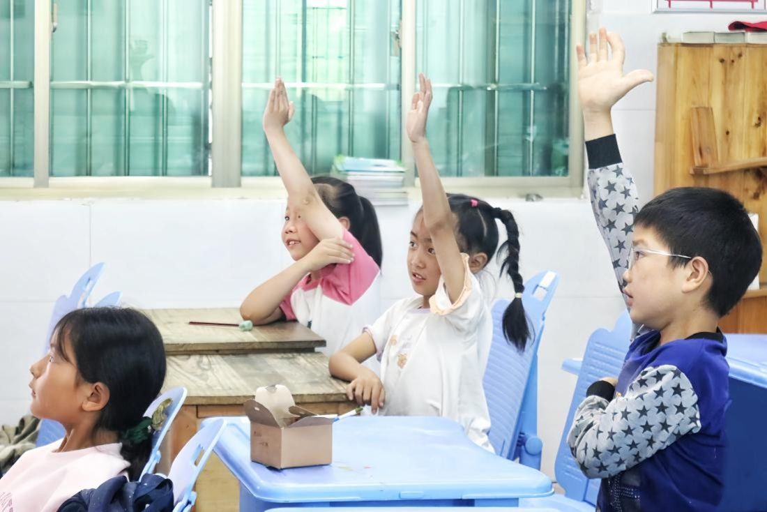 课程最后,主讲人举行了一场情绪辨别比赛,在屏幕上列出动画人物的表情,邀请学生依次做出表情并说出对应的情绪。学生们展现出较高的参与热情,争相举手,且绝大部分学生能完整还原表情并给出准确答案。