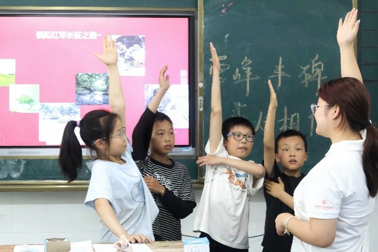 学生们举手回答实践团成员提出的红军长征相关问题。