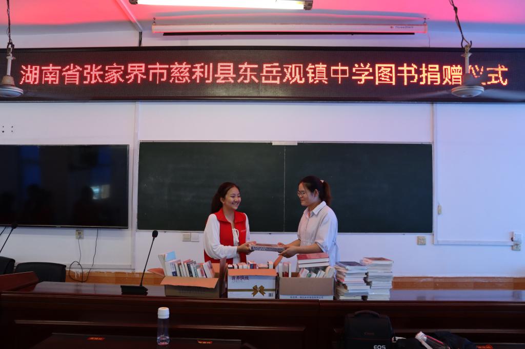 在启动仪式中,队长胡紫昕和副队长王治力完成了湖南出版投资控股集团对东岳观镇中学的图书捐赠。