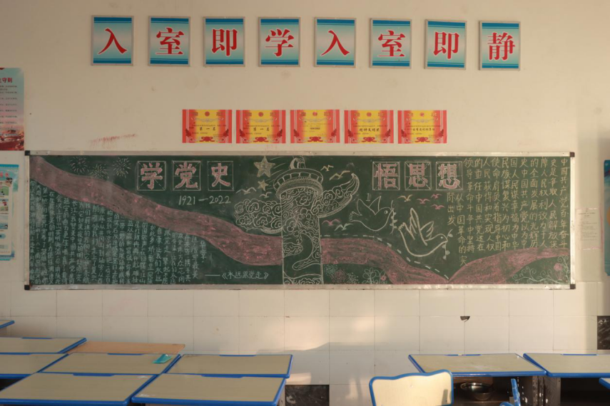 在板报设计的过程中,学生们依托中国共产党党史,中国共产党党员刘胡兰的故事等,结合天安门、中国共产党党旗、和平鸽、华表等绘画元素,充分发挥自身的长处,用别出心裁的创意与优美工整的字迹创作了主题为“学党史,悟思想”、“学习光辉党史,传承红色精神”的板报作品。在实践团成员的鼓励下,学生们精心策划,分工合作,巧妙排版,在创作板报的过程中中追忆红色历史,感悟党的思想。一幅幅板报作品凝聚着学生的智慧,描绘出他们对祖国和党的无限热爱。