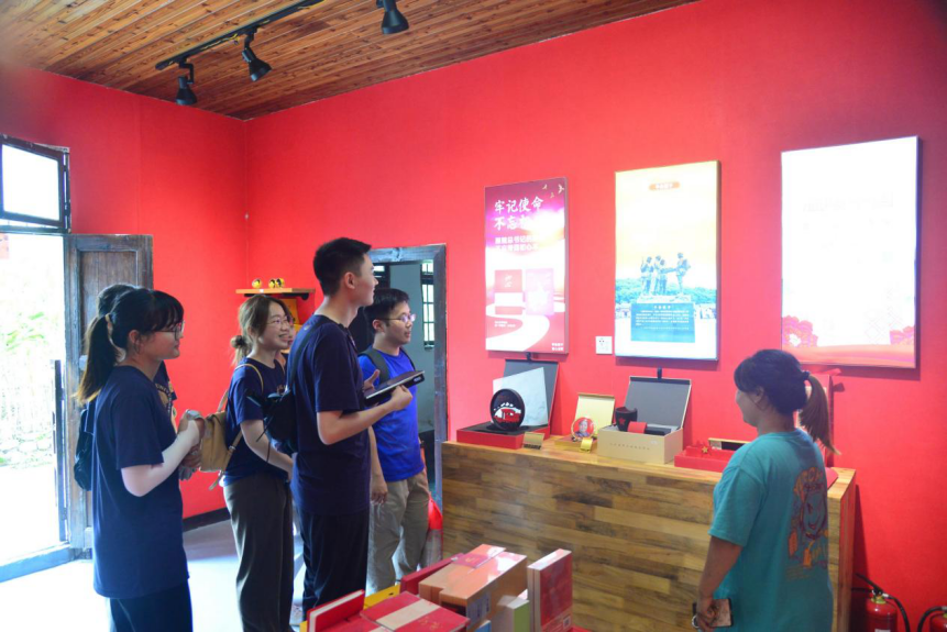 “半条被子”故事发生地旧址不远处,一家由农舍改造的“初心”文创商店吸引了调研队员们的目光。从长征主题手办、红色故事印章到实用、便携的“一床被子”,丰富多样的文创产品为纷至沓来的游客提供了带得走的红色记忆,让沙洲红色故事“活”了起来。店家销售人员详细地介绍了沙洲村“半条被子”主题文创开发与产品销售情况,同学们结合自身开展的“湖湘文化主题剧本杀研发”等“大创”项目实施对当地开展红色旅游和借助文创产品讲好红色故事等情况进行了深入访谈。“在讲好红色故事过程中,我们尤其要将其中动人的红色基因和精神力量传递出去。”调研队员严茳葶表示,沙洲村文创产品的研发为团队开展调研提供了新的启发,在讲好中国红色故事过程中要牢记初心使命,注重形式与内容、动机与效果等高度统一,寻求最大公约数、画好最大同心圆,让中国人民与世界各国人民追求美好生活的梦想相通相融。