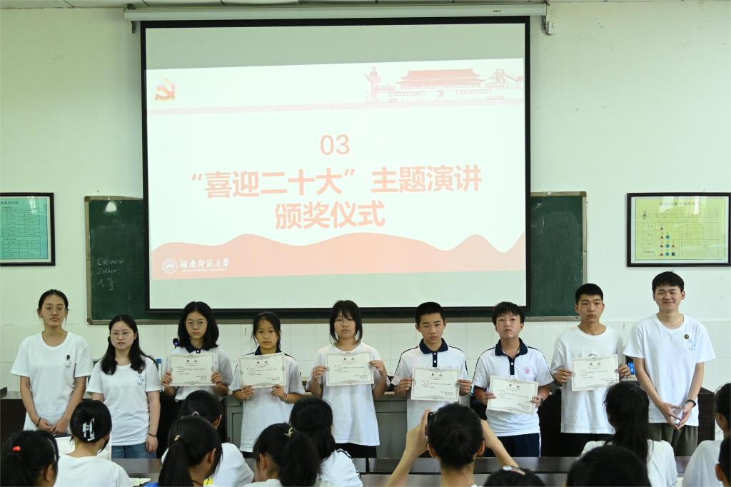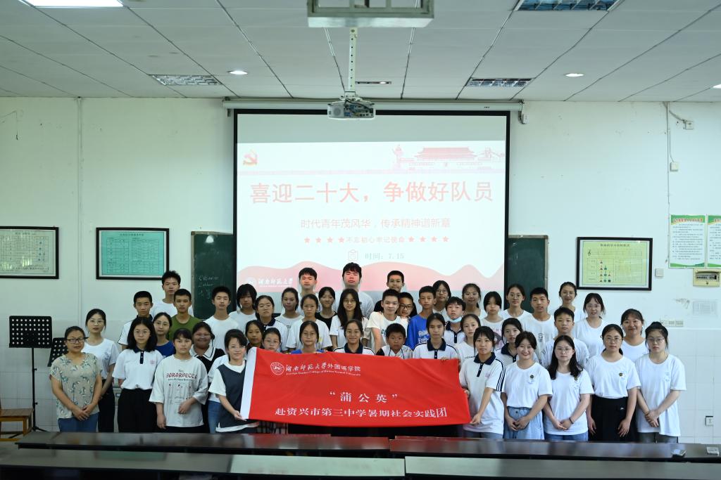 (通讯员 谢璐怡 龚佳倩 刘雨芹)7月15日,为党的二十大胜利营造良好的社会环境,发挥学校的特殊宣传作用,引导学生厚植爱党爱国情感,立志传承红色基因,努力成长为担当民族复兴重任的时代新人,太阳成官网“蒲公英”暑期社会实践团在资兴市第三中学的协助下开展了学生“喜迎二十大”党史主题演讲活动。