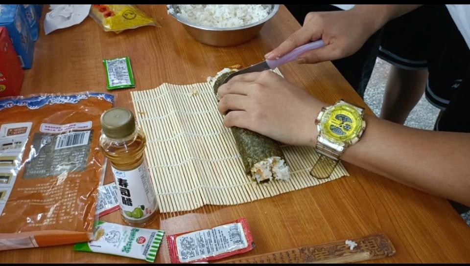 在美食中领略别致风俗,在唇齿间感受异国文化。李蔡浚与夏文媛通过介绍学生们熟悉的常用日语导入课堂,激发学生的参与课堂的积极性,活跃课堂氛围,在此基础上围绕日本的饮食文化、服饰文化、生活传统、名胜美景、特色产业等五个方面进行介绍。为提高学生的课堂参与度,锻炼实践动手能力,李蔡浚和夏文媛分别开展课堂小活动,邀请学生现场制作寿司并品尝日本美食。学生们以饱满的热情积极参与,在老师的指导下、同学之间的合作中完成实践操作。