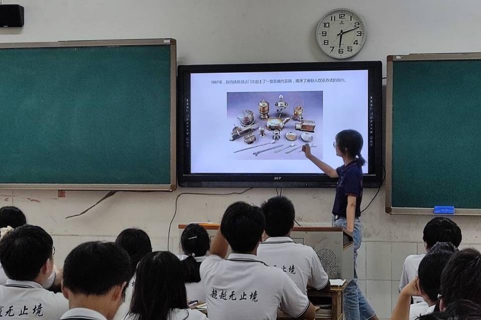 钟诗琪以著名影视作品《梦华录》引入,结合其中精湛的点茶技艺,介绍茶与点茶技艺的起源及茶的不同种类,并用丰富精彩的视频向学生直观展示点茶的具体操作与动作要点。在讲解茶的种类时,钟诗琪以问答的形式启发课堂,帮助学生了解茶的六大分类及各自的英文表达。学生积极参与,课堂气氛活跃。