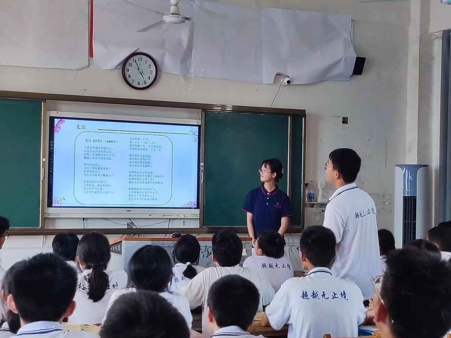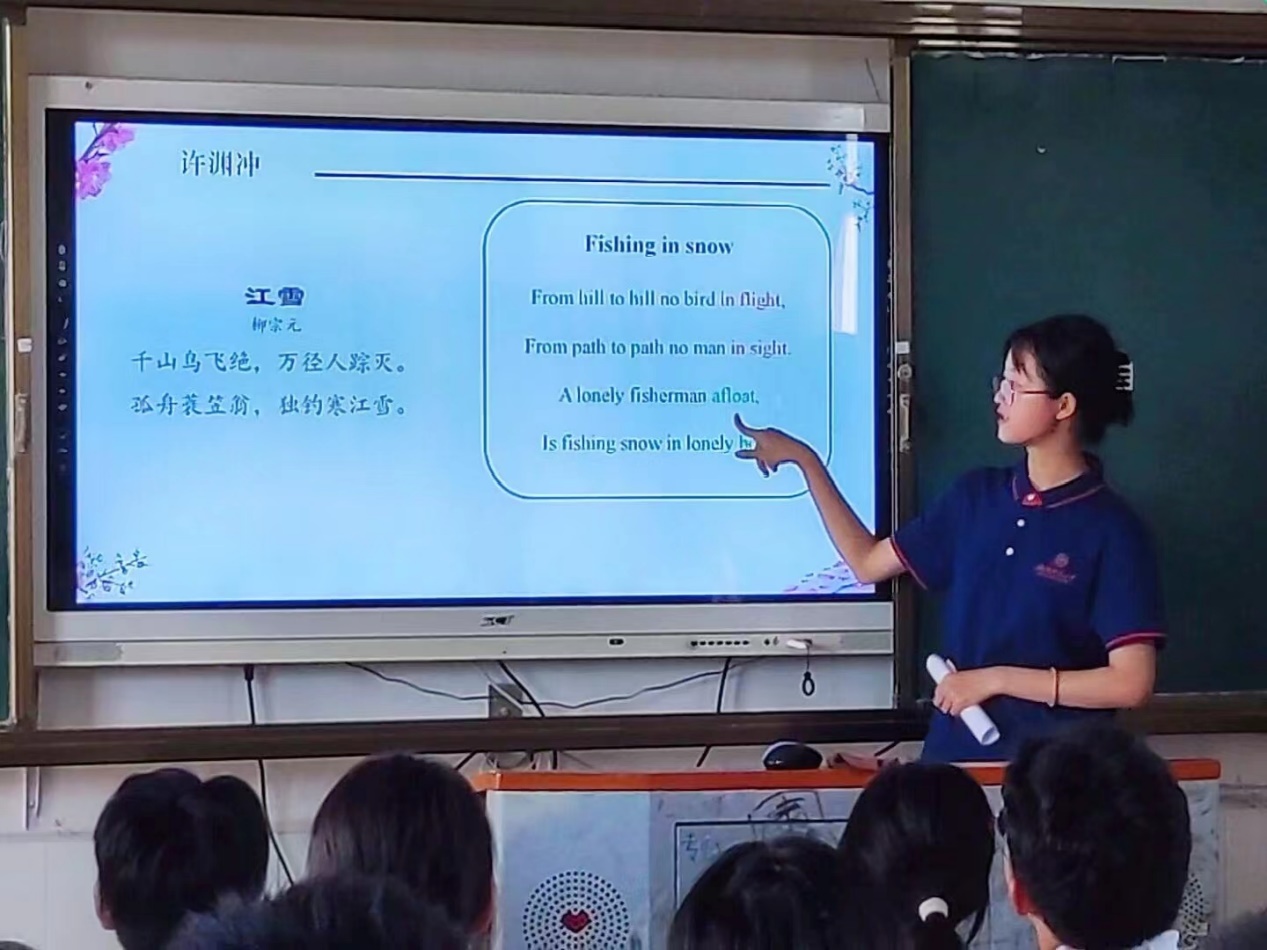 许谱亮以诗人白居易的视频作为课堂导入,通过漫画的形式以及用幽默风趣的语言向同学们介绍白居易的主要生平事迹以及部分代表作,同学们不仅深入了解了“诗魔”白居易,而且懂得了其诗歌的内涵及深意。随后,许谱亮从生平、诗作等方面简要介绍现代诗人北岛,她重点展示北岛的代表作《回答》,两位学生主动举手朗诵此诗,紧接着同学们又共同观看名家李立宏的朗诵。同时,许谱亮以视频的形式介绍宋代欧阳修、苏轼、李清照的精彩词篇,向同学们展示宋词的独特韵味。在课堂最后,许谱亮向同学们介绍“译界泰斗”许渊冲老先生并展示其优秀译作。许谱亮让学生尝试用英文翻译经典诗篇《江雪》,并带领学生们一同欣赏许渊冲的译本Fishing in the snow。许谱亮以许渊冲老先生的名言“好上加好、精益求精、不到绝顶、永远不停”作为结束语勉励学生,鼓励他们在今后以更积极的态度和行动认识、学习诗词。本次课堂学生积极参与教学,热情回应老师的提问,课堂氛围轻松愉悦。